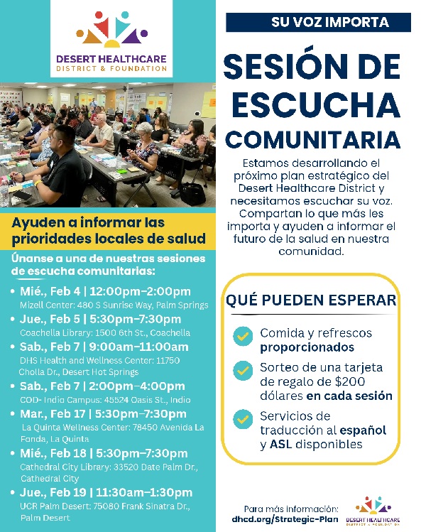 As the Desert Healthcare District & Foundation Board and staff develop a new strategic plan to inform future funding and programming decisions over the next five years, we welcome Coachella Valley residents to engage with us in the process. We have scheduled seven community listening sessions in February 2026 (please see below) where you can share your health and wellness priorities. With your input, our objective is to approve and adopt a new five-year strategic plan this year. Please join the conversation.