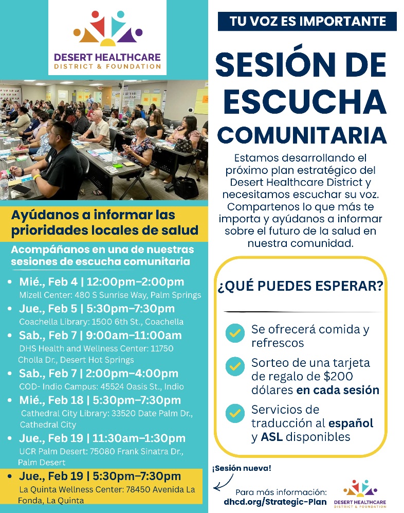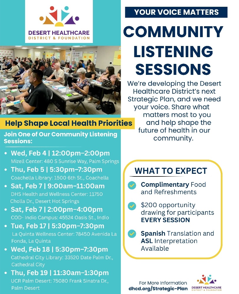 As the Desert Healthcare District & Foundation Board and staff develop a new strategic plan to inform future funding and programming decisions over the next five years, we welcome Coachella Valley residents to engage with us in the process. We have scheduled seven community listening sessions in February 2026 (please see below) where you can share your health and wellness priorities. With your input, our objective is to approve and adopt a new five-year strategic plan this year. Please join the conversation.
